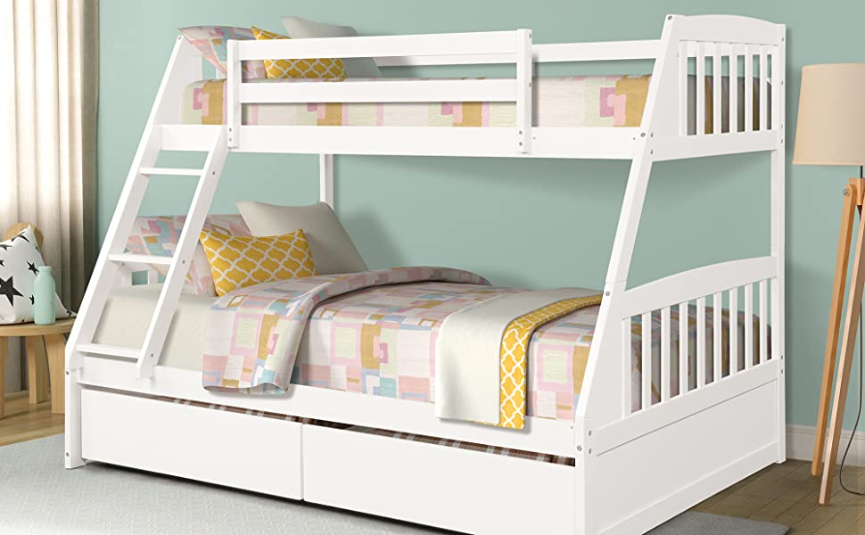 Comes with guard rails on the top bunk for protection and two drawers on the bottom for storage.